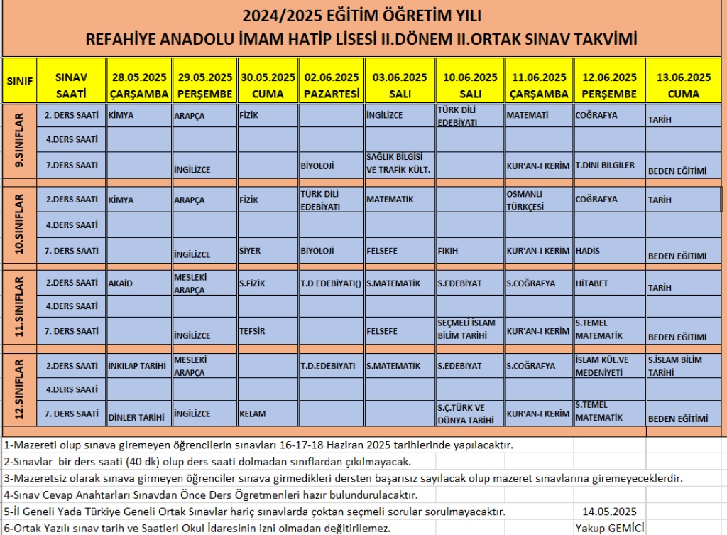 REFAHİYE İMAM HATİP LİSESİ 2. DÖNEM 1. ORTAK SINAV UYGULAMA TARİHLERİ BELLİ OLDU.
